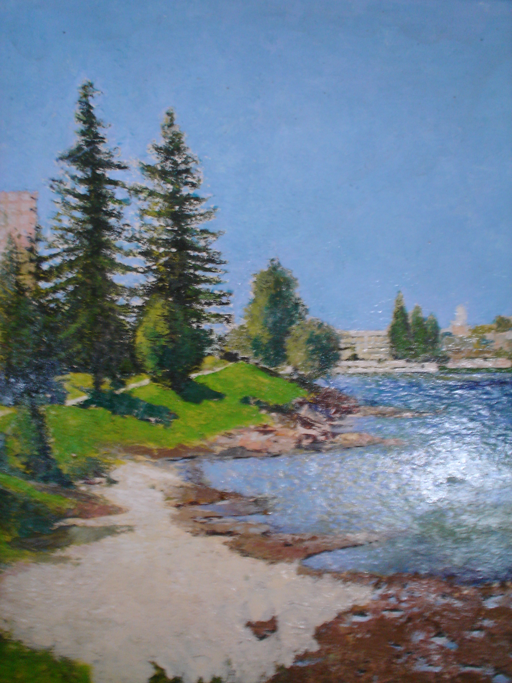 This beautiful oil painting is of a harbour beach on the foreshore walk to Manly. Manly is located 7 miles from central Sydney and is accessed by ferry.